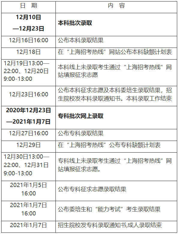 【摘要】根據(jù)上海市有關成人高考的通知公告可知,2020年上海市 成人高校招生錄取時間 已公布,具體如下: 2020年上海市成人高校招生錄取工作將于 2020年12月10日至2021年1月7日 進行。錄取將分...