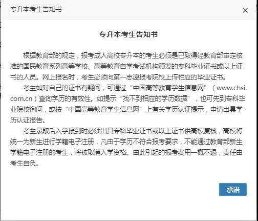 5.“報考層次”:分為專升本、高起本、高起專三類,只有“文化程度”項在大專及以上的考生才能報考專升本層次的專業(yè)。不同的報考層次對應(yīng)不同的志愿輸入填報方式。專升本考生要閱讀告知書和承諾書。