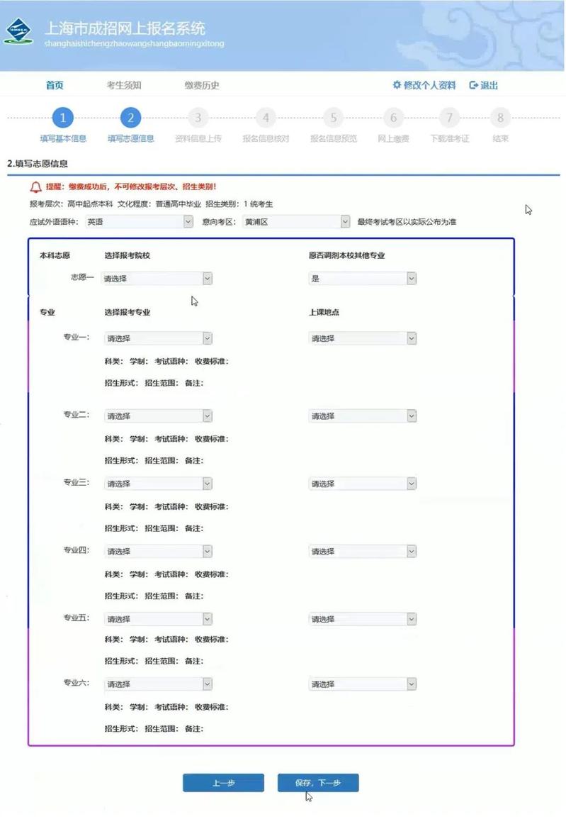 2.專業(yè)填報請參照《上海市成人高校招生專業(yè)目錄》。各專業(yè)志愿必須一致或兼容。