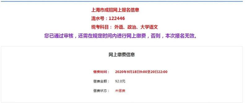 4、報名成功確認(rèn)后,考生必須于9月18日(星期五)至9月20日(星期日)每天9:00~22:00,登錄【上海招考熱線】官方網(wǎng)站(http://www.shmeea.edu.cn)進入本系統(tǒng)按時完成繳費,否則本次報名無效。