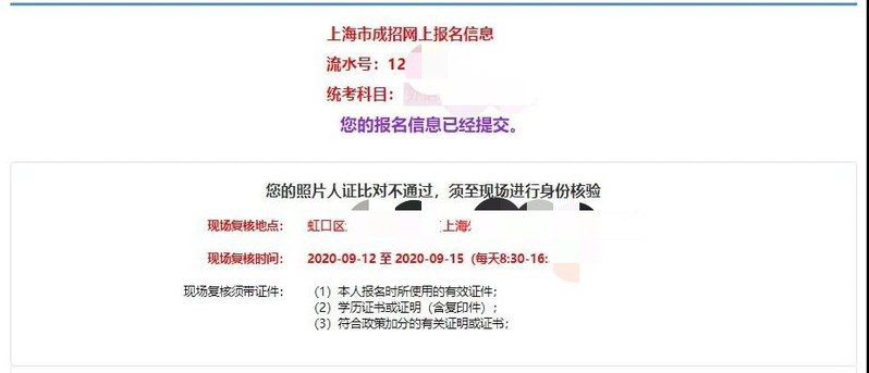 3、如果人證比對不通過,考生報名信息提交后,系統(tǒng)在預(yù)覽頁會提示考生必須到一志愿院校做現(xiàn)場信息核驗。9月12日至9月15日(每日8:30~16:30)考生到所報第一志愿的高校進行現(xiàn)場信息復(fù)核。(見下圖)